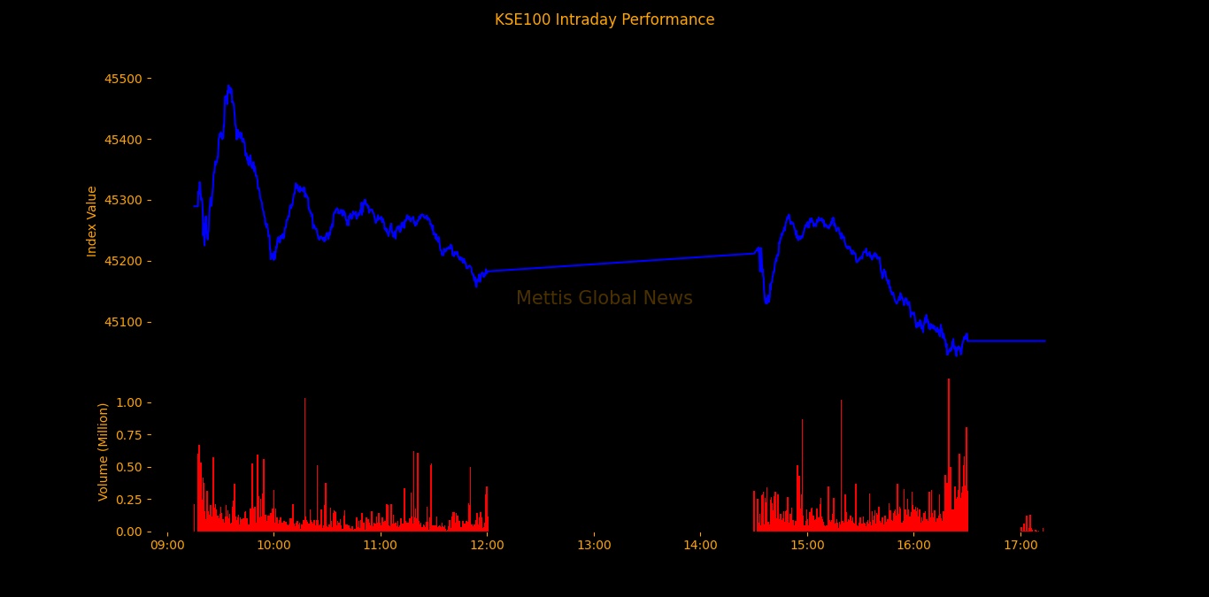 The index traded in a range of 445.28 points showing an intraday high of 45,488.45 and a low of 45,043.17.