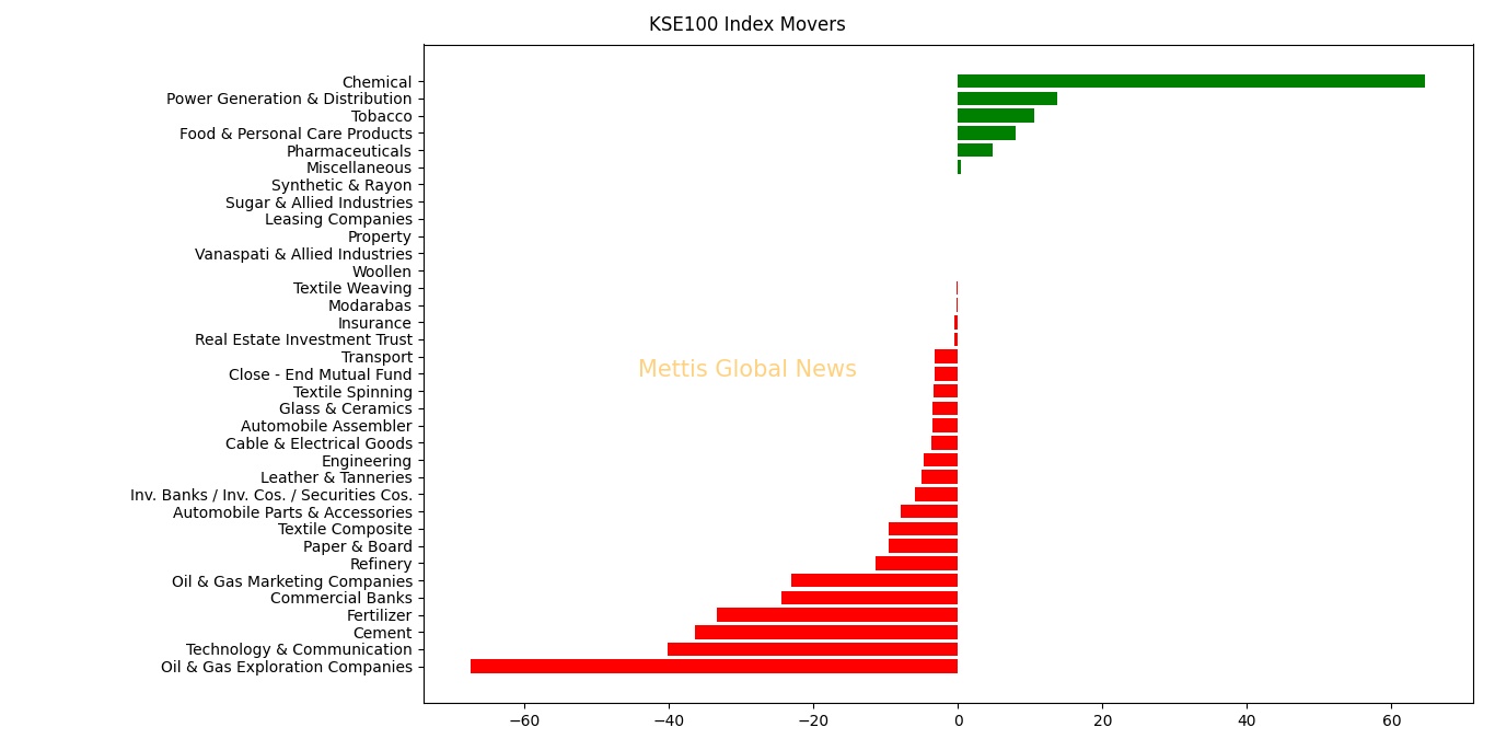 KSE100 Index was let down by Oil & Gas Exploration Companies with 67.42, Technology & Communication with 40.14, Cement with 36.39, Fertilizer with 33.34 and Commercial Banks with 24.48 points.