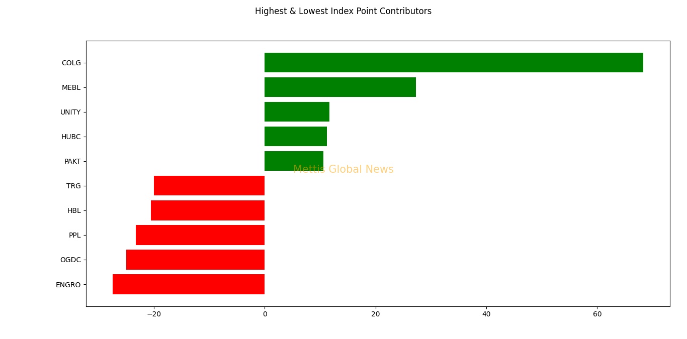 Companies adding points to the index were COLG with 68.32, MEBL with 27.24, UNITY with 11.66, HUBC with 11.19 and PAKT with 10.57 points.