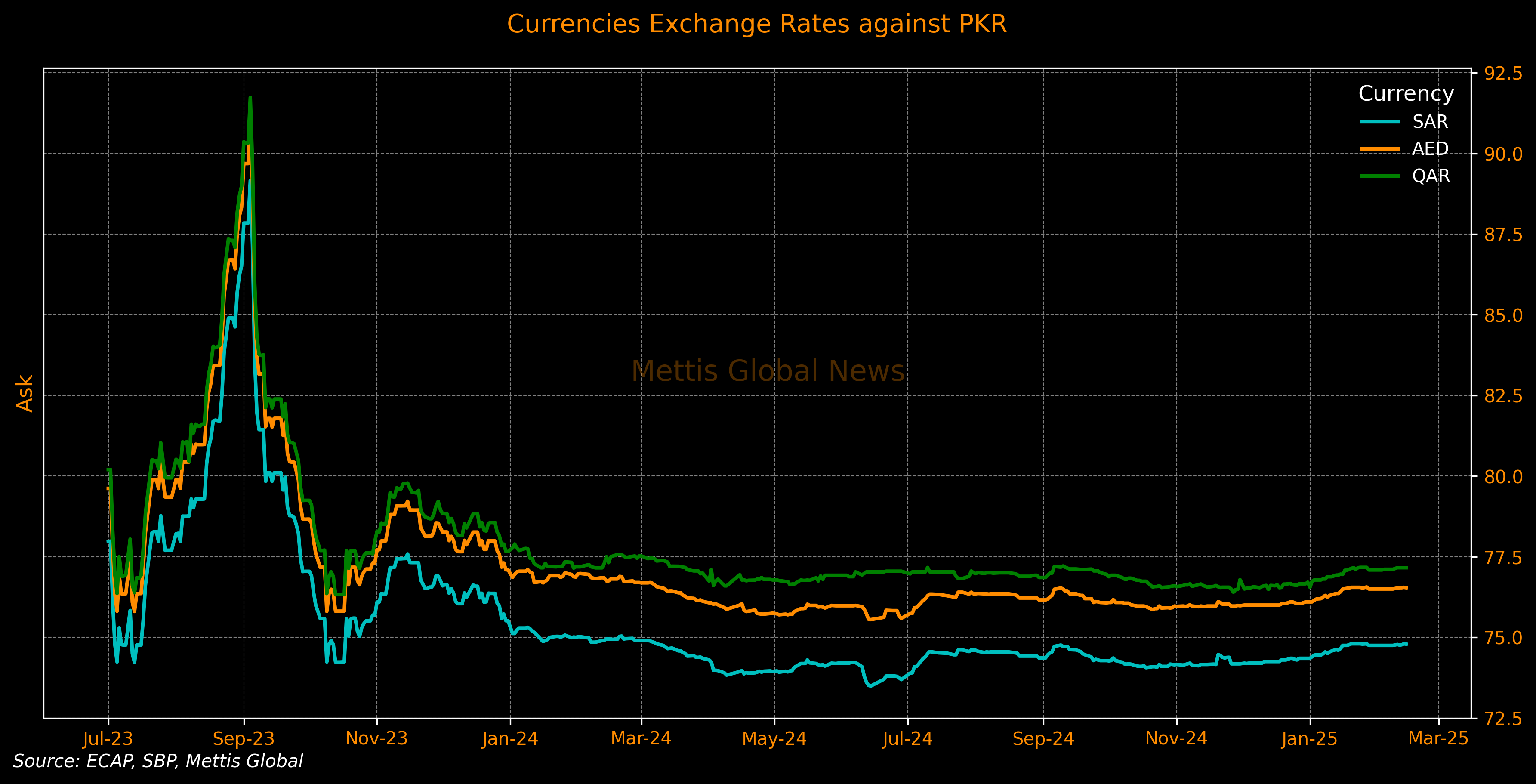Since a significant portion of the Pakistani diaspora resides in Middle Eastern countries, the exchange rates of PKR against AED and SAR are closely monitored for remittances and business transactions.