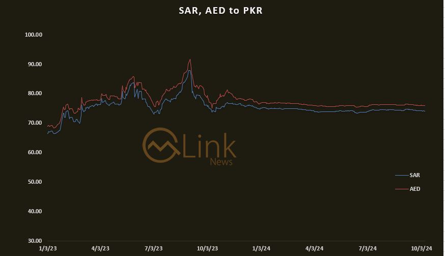 October 09, 2024 (MLN): The exchange rates for Saudi Riyal (SAR) and UAE Dirham (AED) remained largely stable in today’s open market as the buying rate for Saudi Arabia Riyal (SAR) in Pakistan stood at Rs73.52, while the selling rate was Rs74.17.