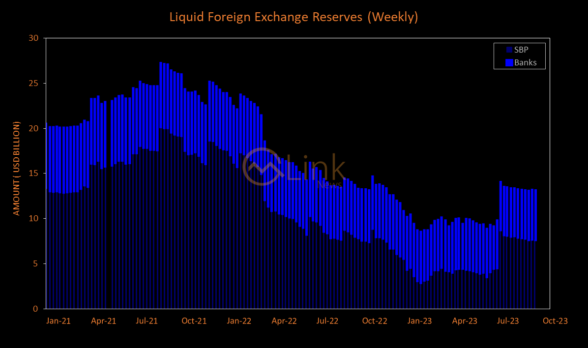 September 28, 2023 (MLN): The foreign exchange reserves held by the State Bank of Pakistan (SBP) fell by $58.6 million or 0.76% WoW to $7.64 billion during the week ended on September 22, 2023, according to the data released by the central bank on Thursday.