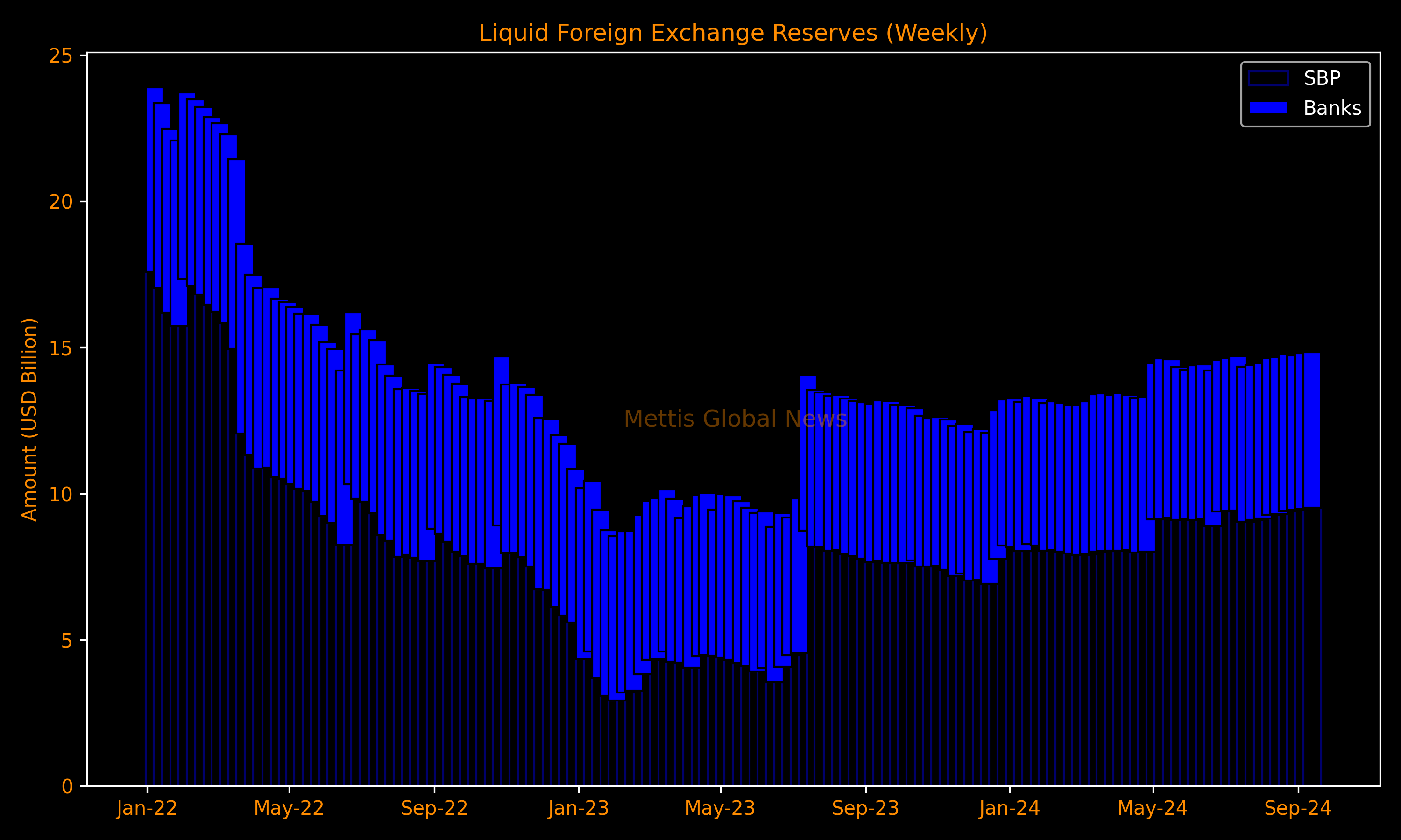 September 19, 2024 (MLN): The foreign exchange reserves held by the State Bank of Pakistan (SBP) increased by $43 million or 0.45% WoW to $9.51 billion during the week ended on September 13, 2024, data released by State Bank of Pakistan showed on Thursday.